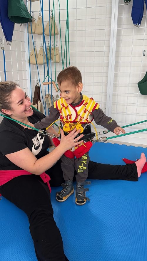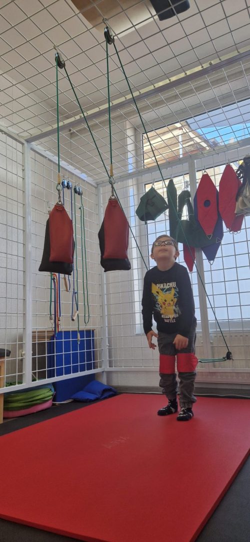 Sustav kolotura, pojaseva i utega omoguฤuje da izolirano jaฤamo miลกiฤe koji su kljuฤni za pravilno drลพanje i pokretanje. Dijete u sigurnom okruลพenju uฤi aktivirati prave miลกiฤe โ ลกto kasnije dovodi do boljeg hoda, posturalne stabilnosti i veฤeg funkcionalnog napretka.